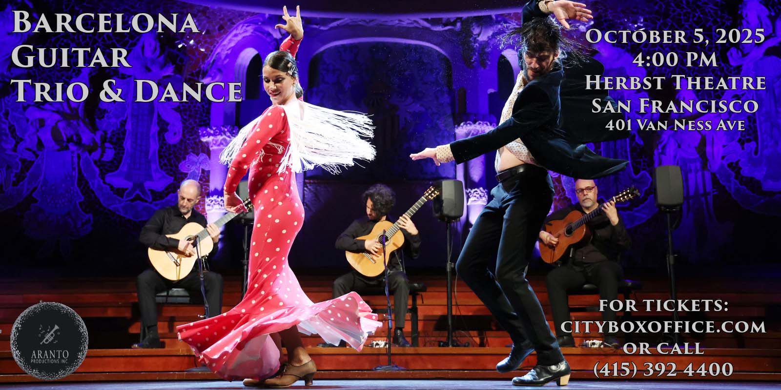 The ensemble has graced prestigious venues worldwide, including the Emirates Palace in Abu Dhabi, the Seoul Arts Theater, and the Tel Aviv Opera House. In Barcelona, they frequently perform at the Palau de la Musica Catalana, a UNESCO World Heritage Site celebrated for its stunning modernist architecture and exceptional acoustics. Experience the passion, rhythm, and artistry of Spain as Barcelona Guitar Trio & Dance brings their electrifying performance to San Francisco for the very first time. Presented by Aranto Productions, this unforgettable evening will take place at the Herbst Theatre, San Francisco.